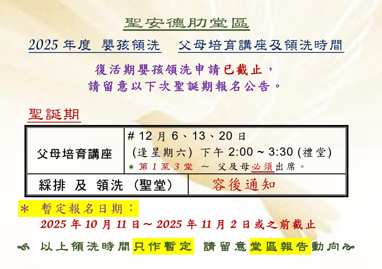 2025年度 嬰孩領洗時間表